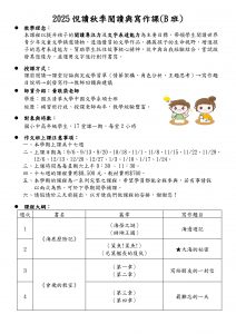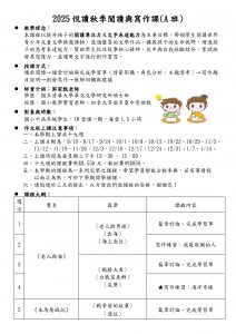 2025悅讀秋季閱讀與寫作課(A、B班) 秋季班課程已經出來囉~ 閱讀與寫作課透過優質的文學作品, 培養孩子的閱讀專注力及文字表達能力。 歡迎詢問課程 報名專線(03)657-6283 Line ID:@ibn7490q 2025悅讀秋季閱讀與寫作課