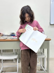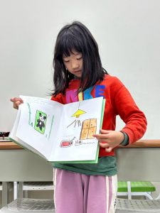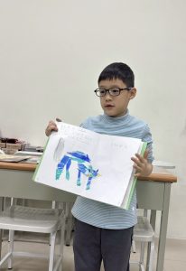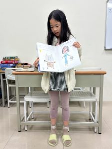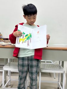 這次的課程除了讀繪本,孩子們也學習創作,寫故事、畫插圖,內容活潑有趣,插畫也充滿著童趣,老師讓孩子成果發表,介紹自己的創作